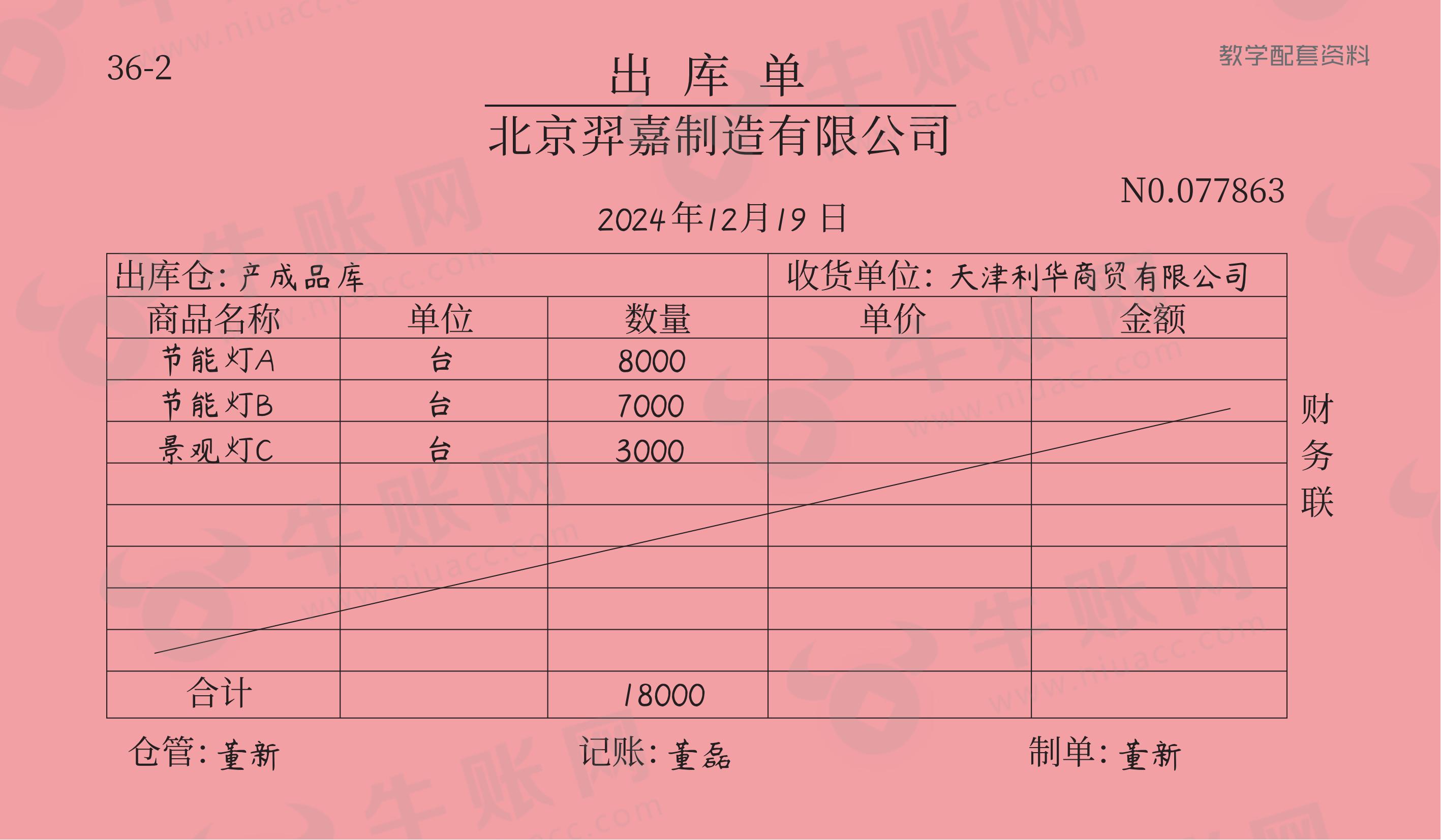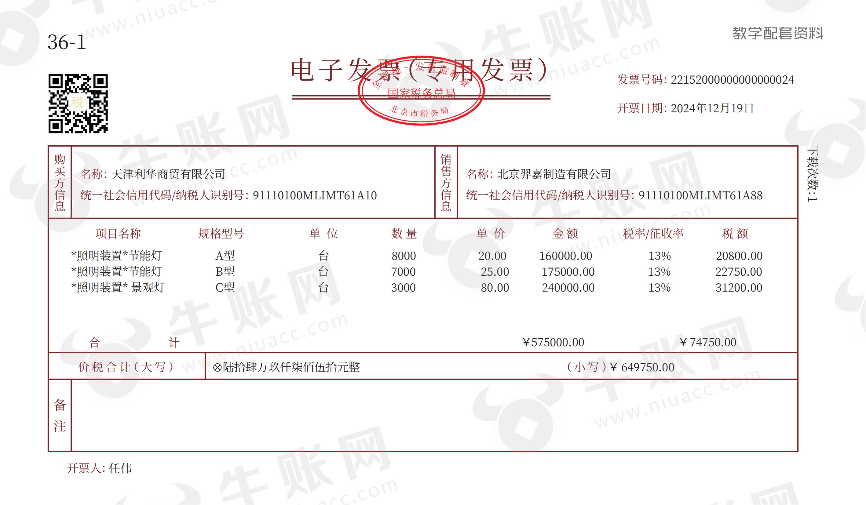 12月19日,将天津利华商贸有限公司订购的节能灯A型8000件,节能灯B型7000件,景观灯C型3000件全部发出,发票随货物一起开具,剩余货款尚未收到。(注:合同约定质保期,质保期内无质量问题买方同意付款)