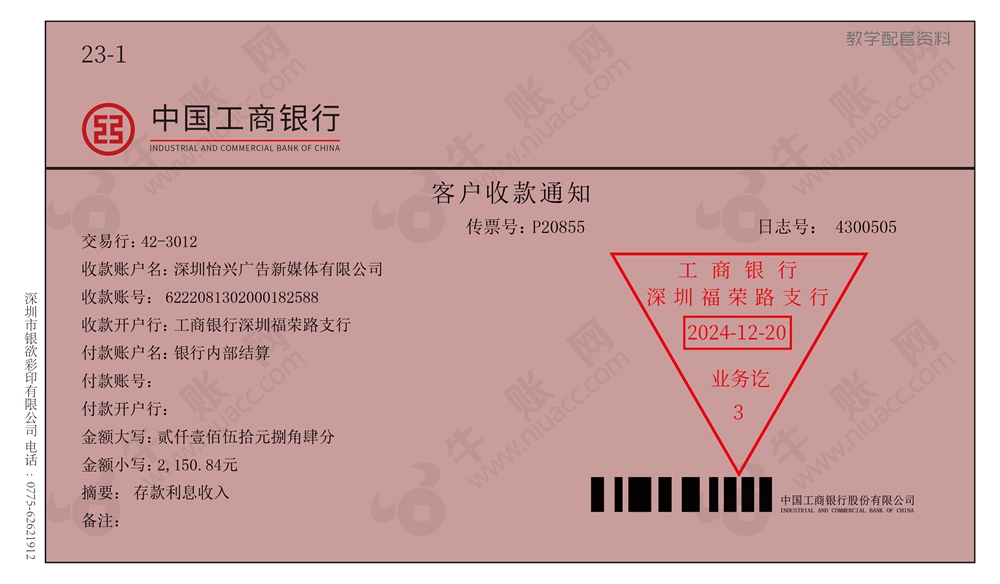 12月20日,收到银行存款利息收入2,150.84元。
