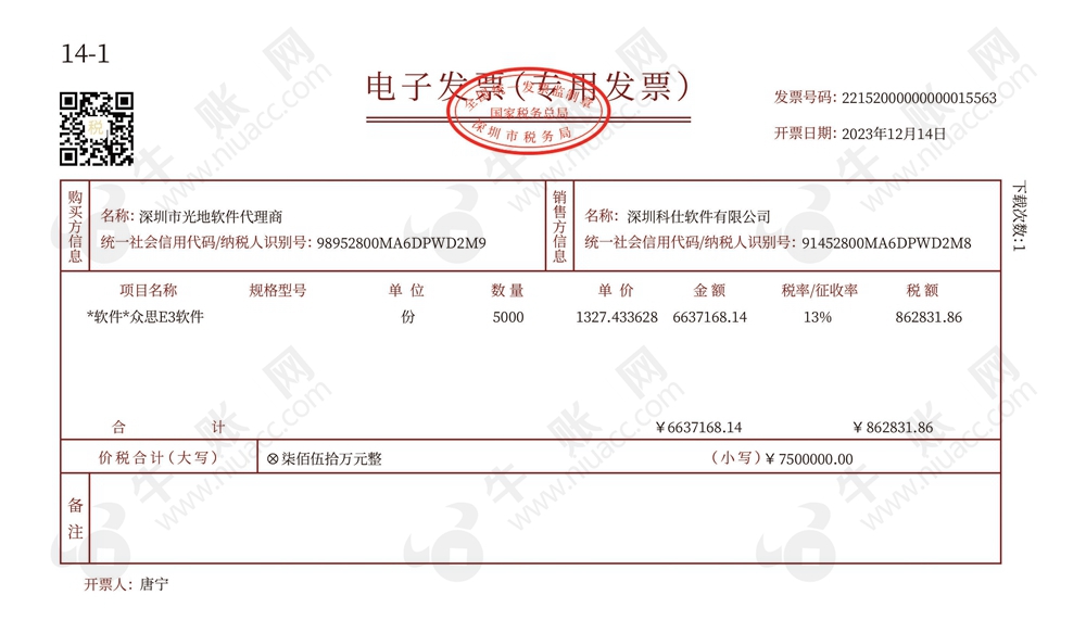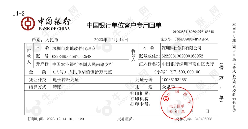 | 销售众思E3软件 | 银行存款-中国银行深圳市南山区支行 | 7500000.00 | |