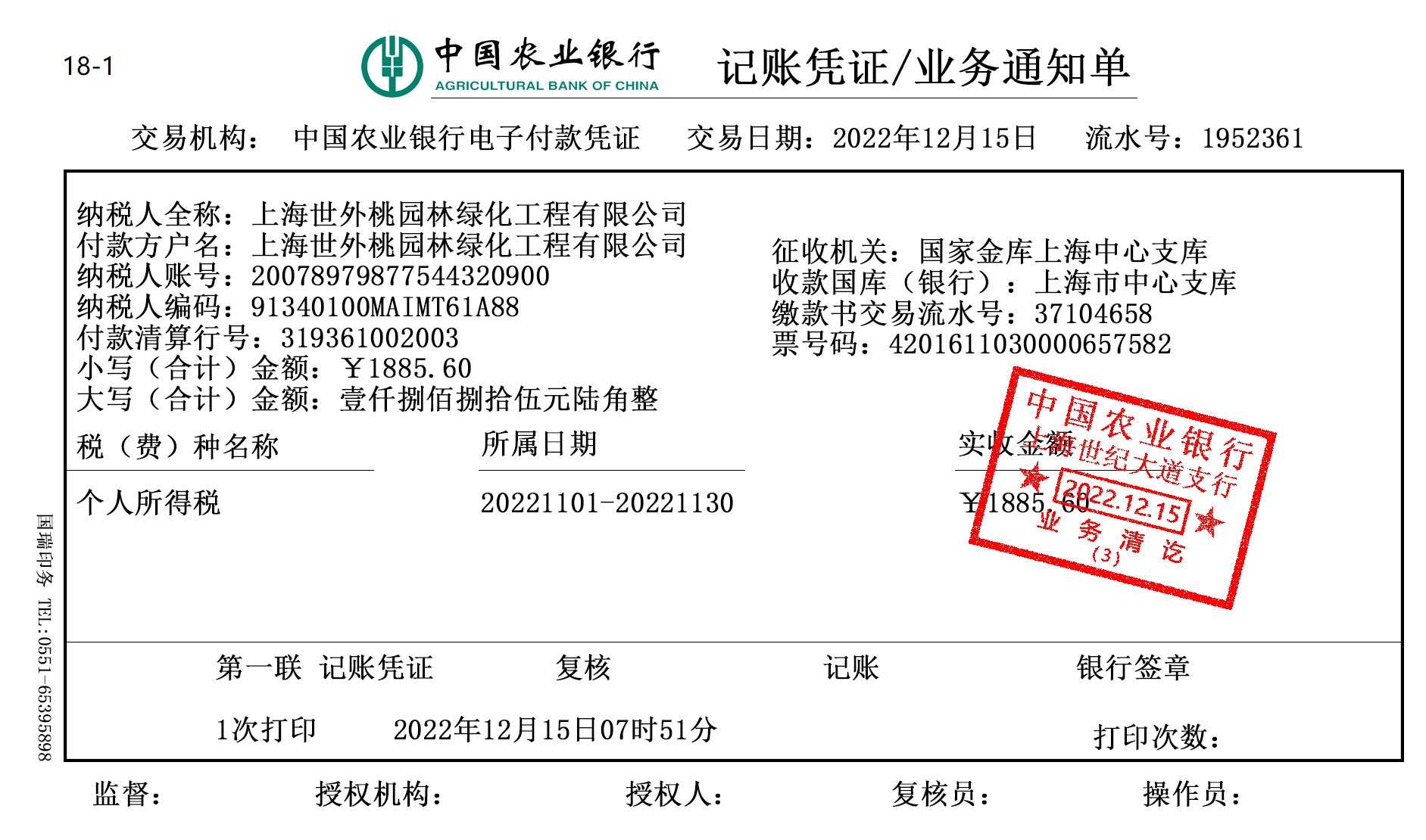 业务18. 12月15日,银行账户扣缴个税1885.60元。