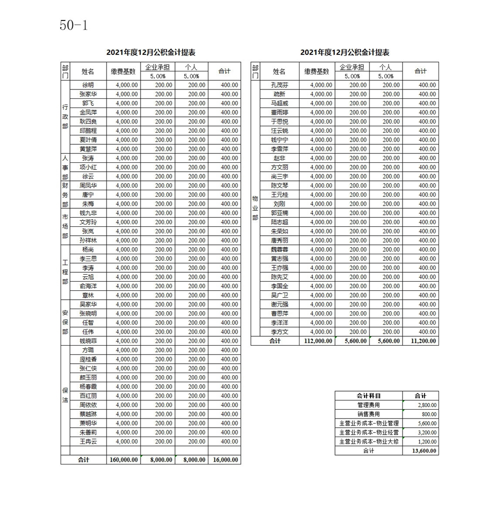 | 计提物业部住房公积金 | 主营业务成本-物业管理 | 5600.00 | |